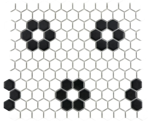 MOZAIKA CERAMICZNA HEXAGON, BIAŁO-CZARNY HEKSAGON ZE WZOREM
