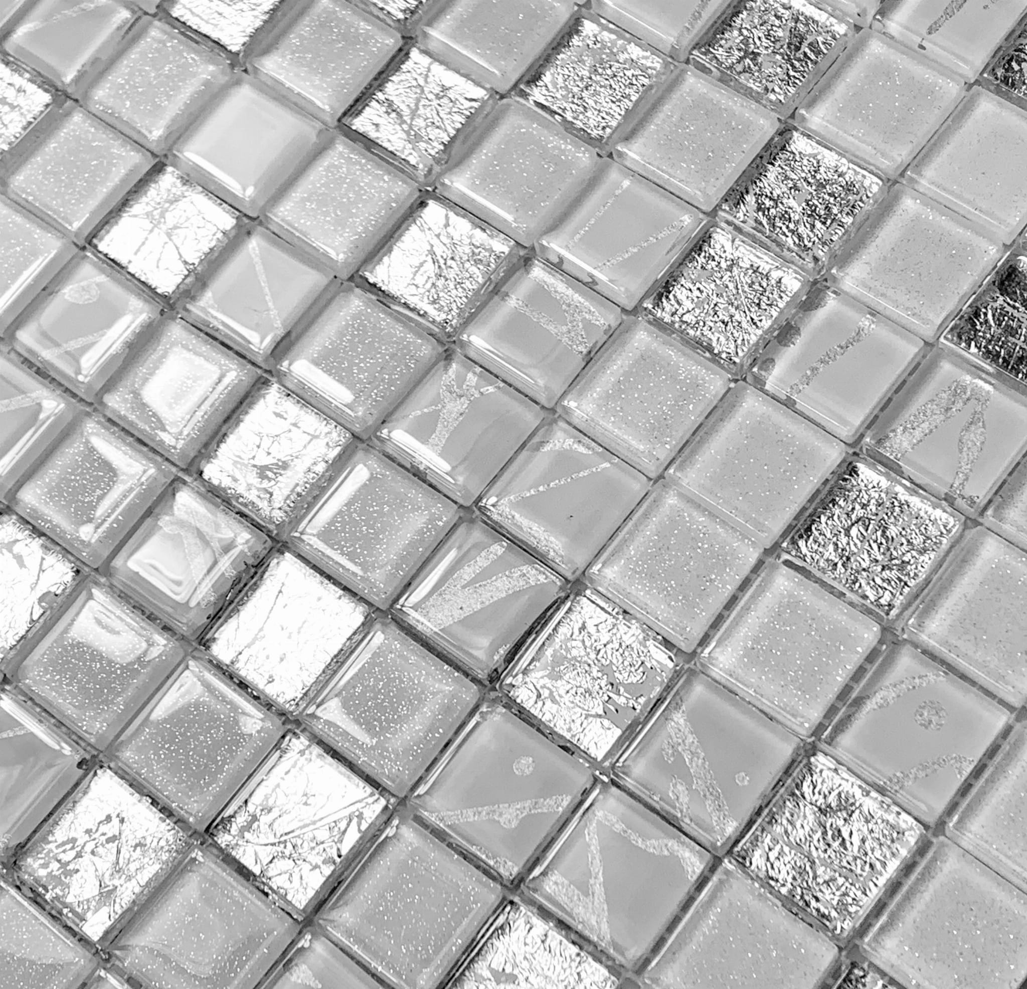 mozaika szklana w kolorze śnieżnej bieli z delikatnym połyskującym srebrnym brokatem w połączeniu z metalicznym srebrem