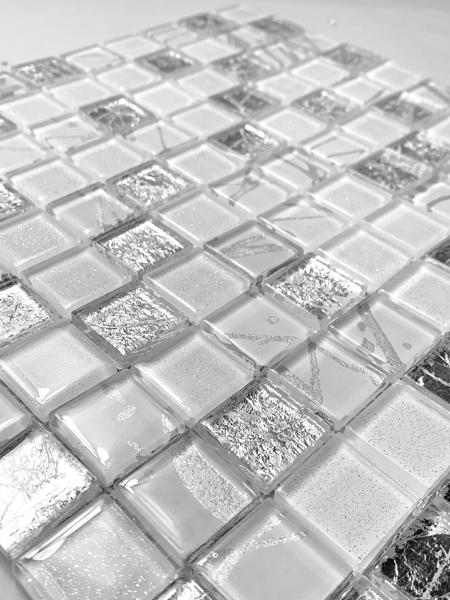 Mozaika szklana biała z drobinkami mieniącego brokatu i niesamowicie błyszczącym srebrem