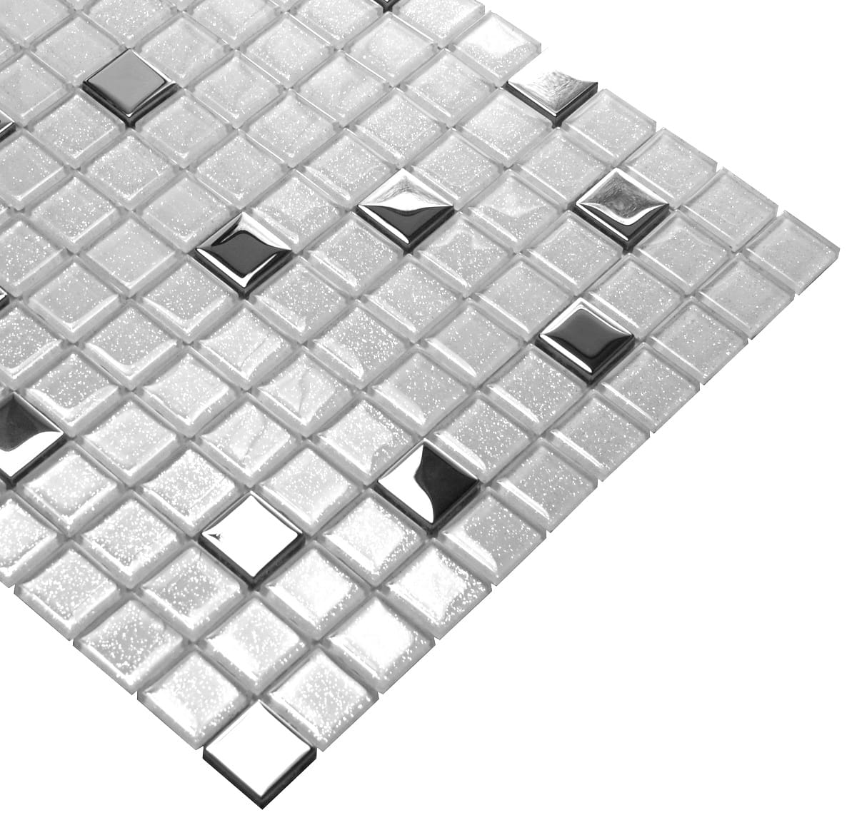 Mozaika szklana biała z drobinkami mieniącego brokatu i srebrnymi metalicznymi elementami