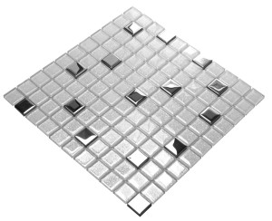 Mozaika szklana w kolorze białym z drobinkami połyskującego brokatu w kolorze srebrnym z dodatkiem srebrnych metalicznych elementów