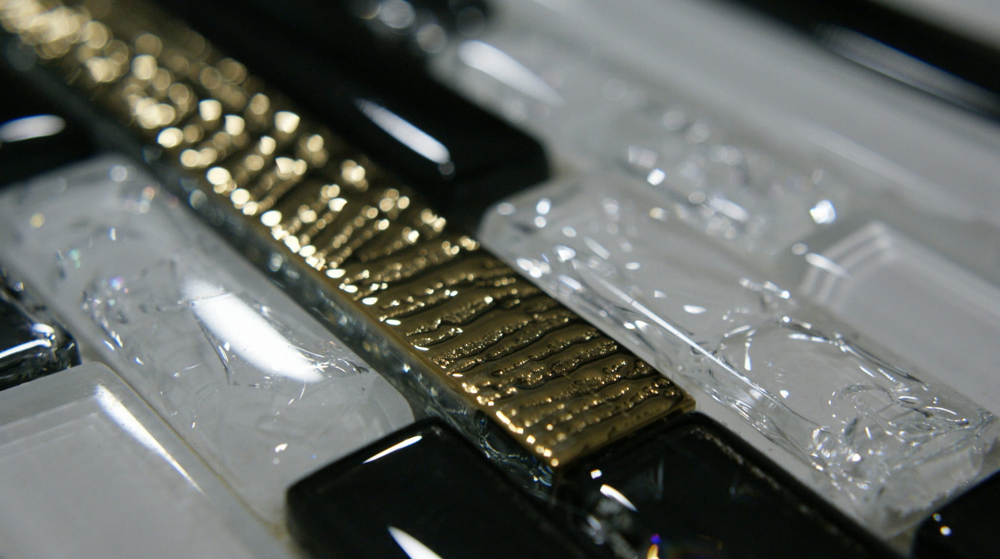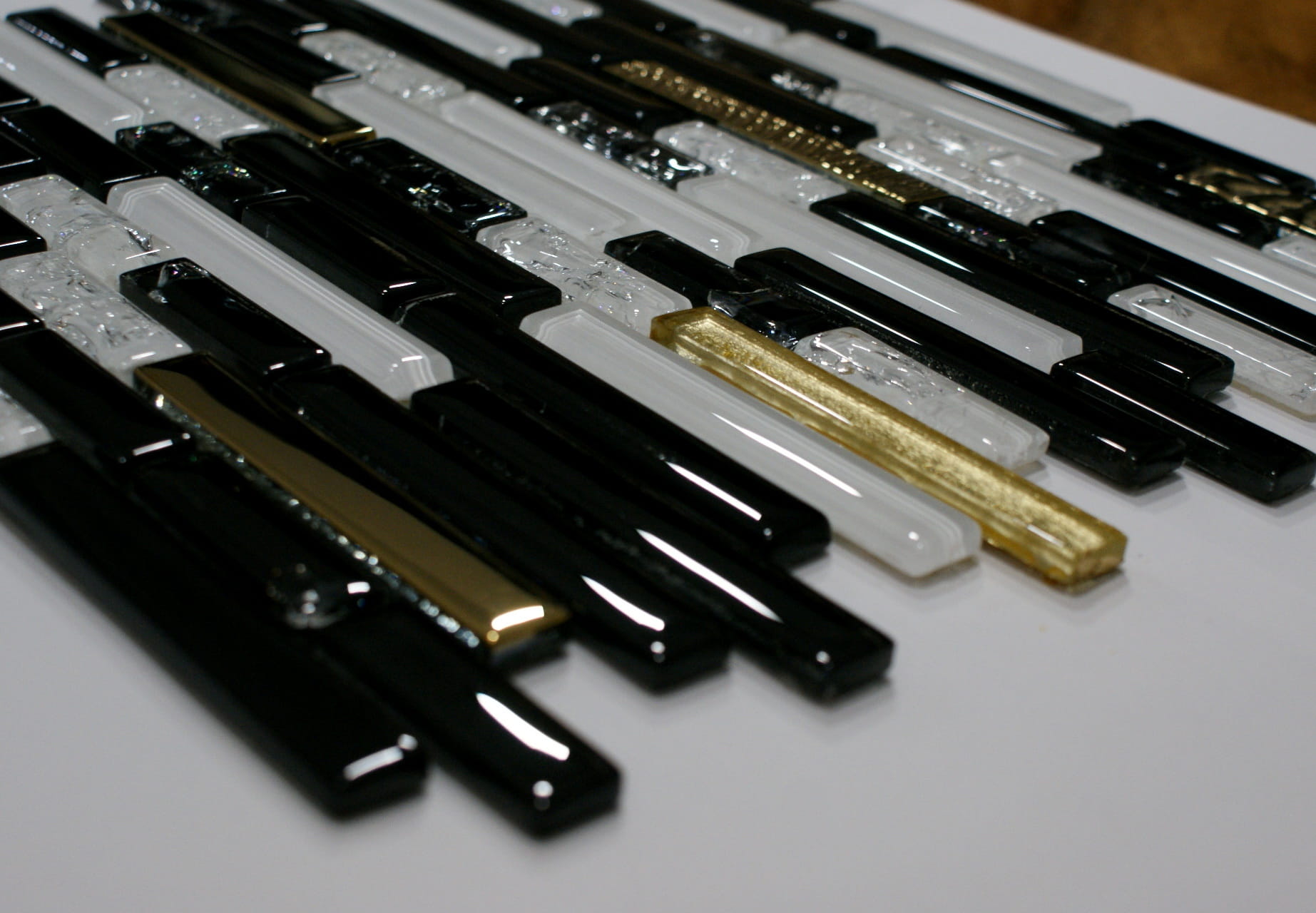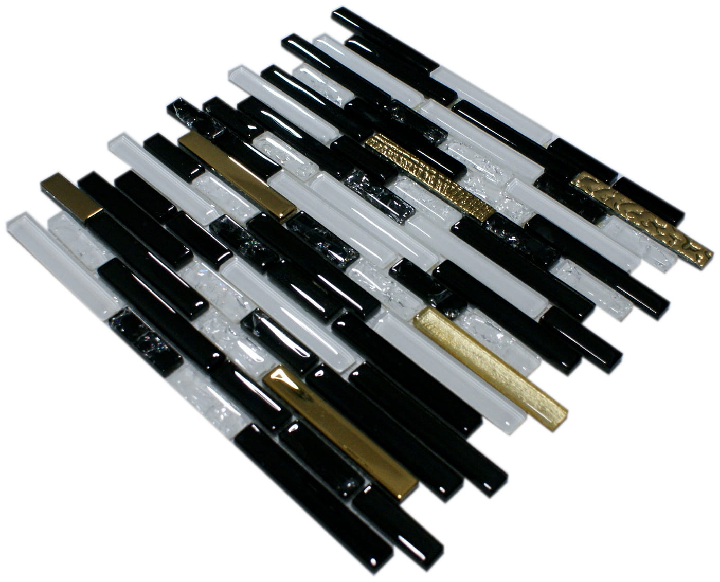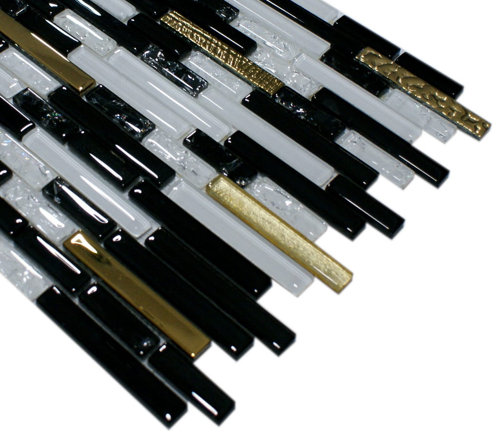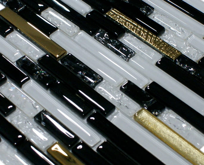 Mozaika szklana w kolorze śnieżnej bieli i głębokiej czerni z elementami mrożonego szkła w połączeniu z niezwykle mieniącym metalicznym złotem