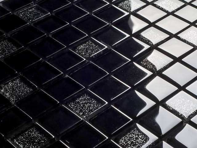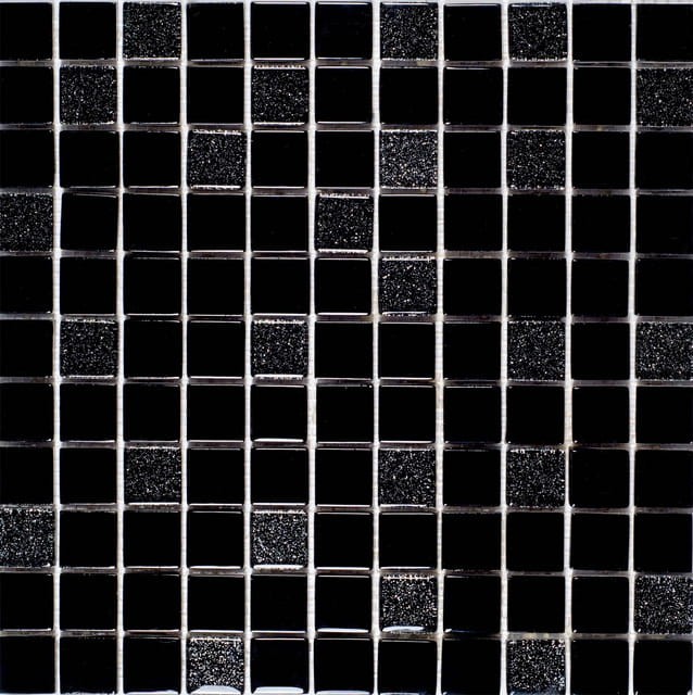 Mozaika o prostej formie i głębi czerni rozświetlona delikatnym srebrnym brokatem.