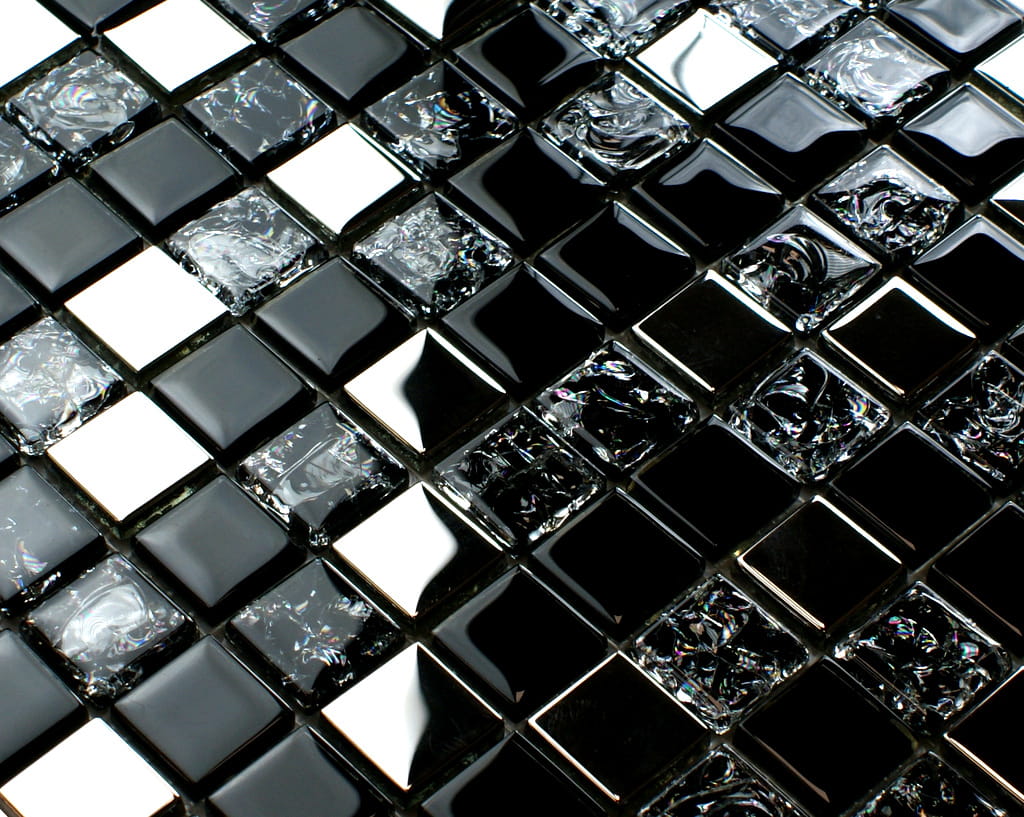 Mozaika szklana w kolorze głębokiej czerni z dodatkiem mieniącego metalicznego srebra i efektem mrożonego szkłą