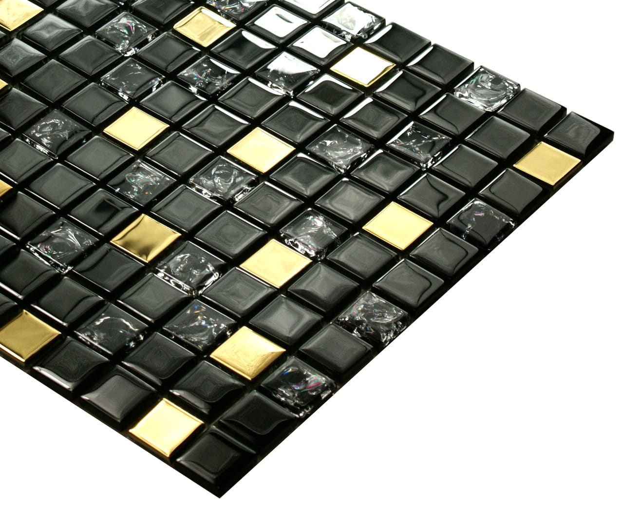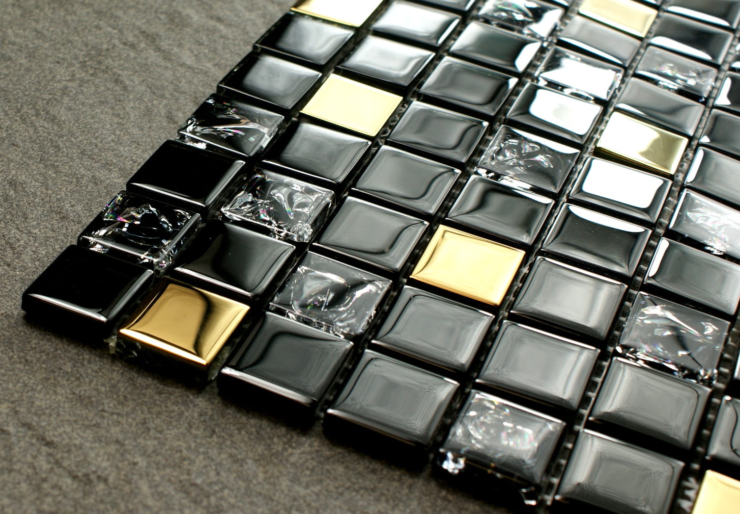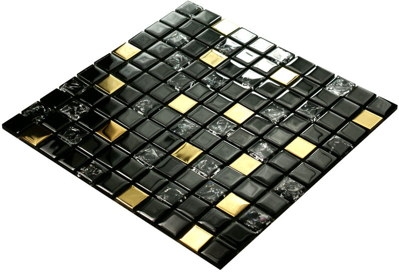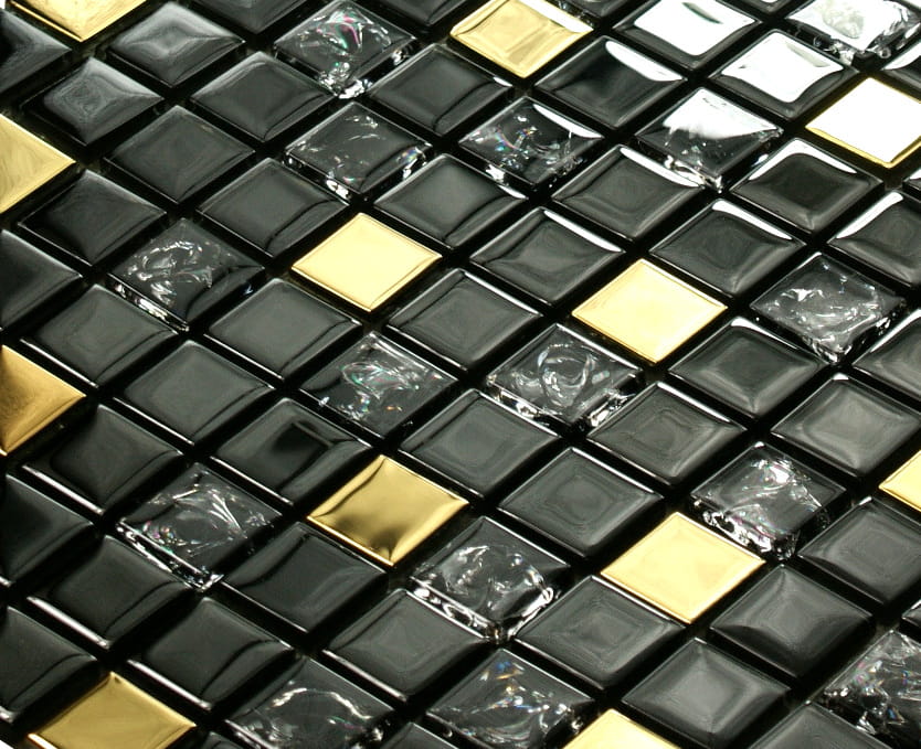 Mozaika szklana czarna z efektem mrożonego szkła i dodatkiem złotych elementów