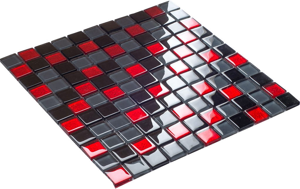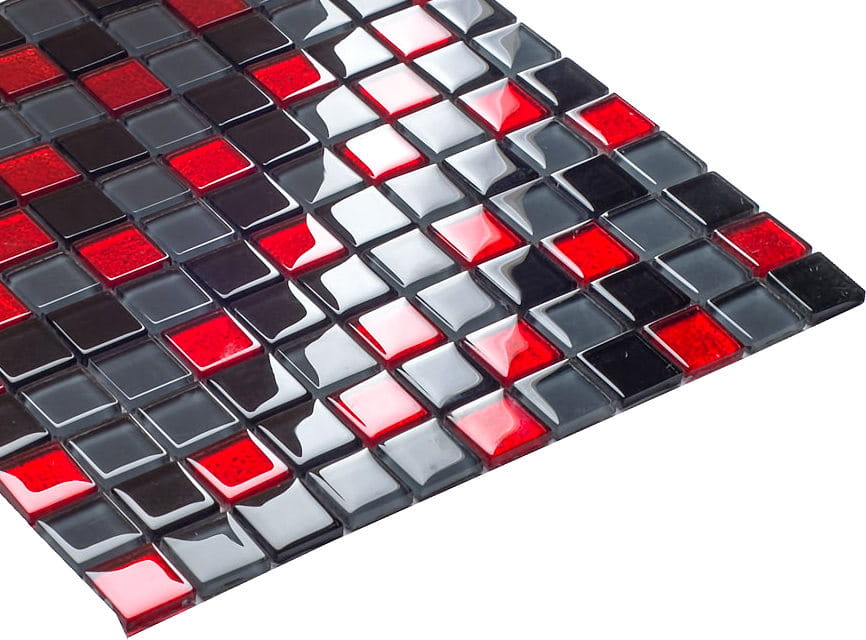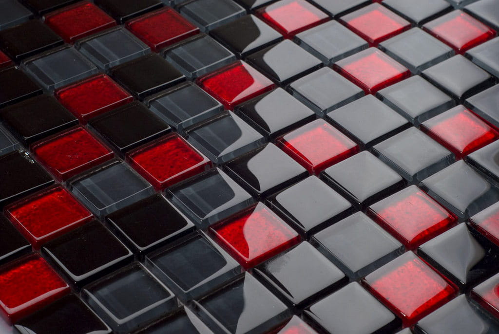 Mozaika szklana w kolorze szarości i intensywnej czerwieni .