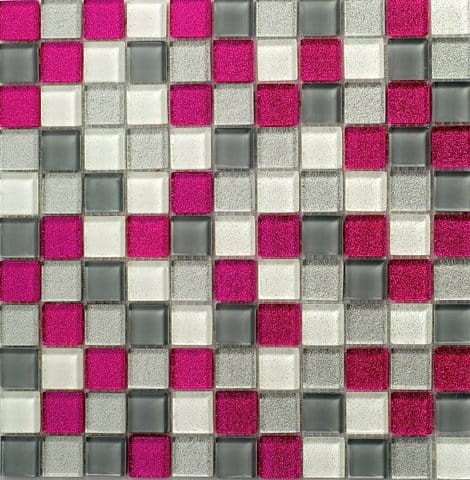 Mozaika szklana mix kolorów białego, srebrnego oraz różowego z brokatami.