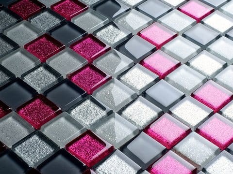 Mozaika szklana w kolorach srebra, bieli i różu z brokatami.