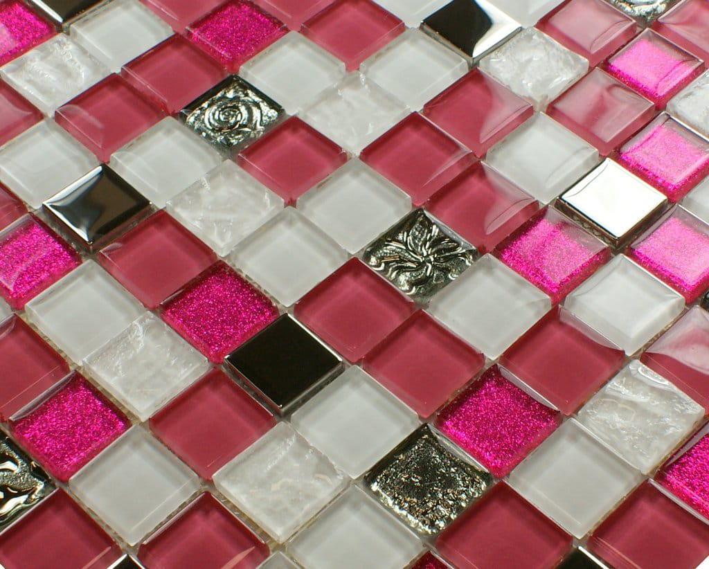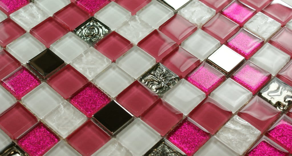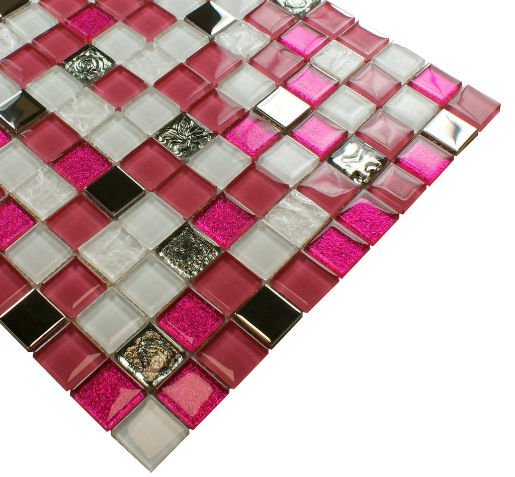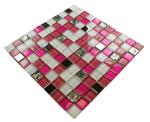 Połączenie błyszczącej mozaiki różowej z metalicznymi srebrnymi elementami o ciekawej strukturze i różową mozaiką z brokatem