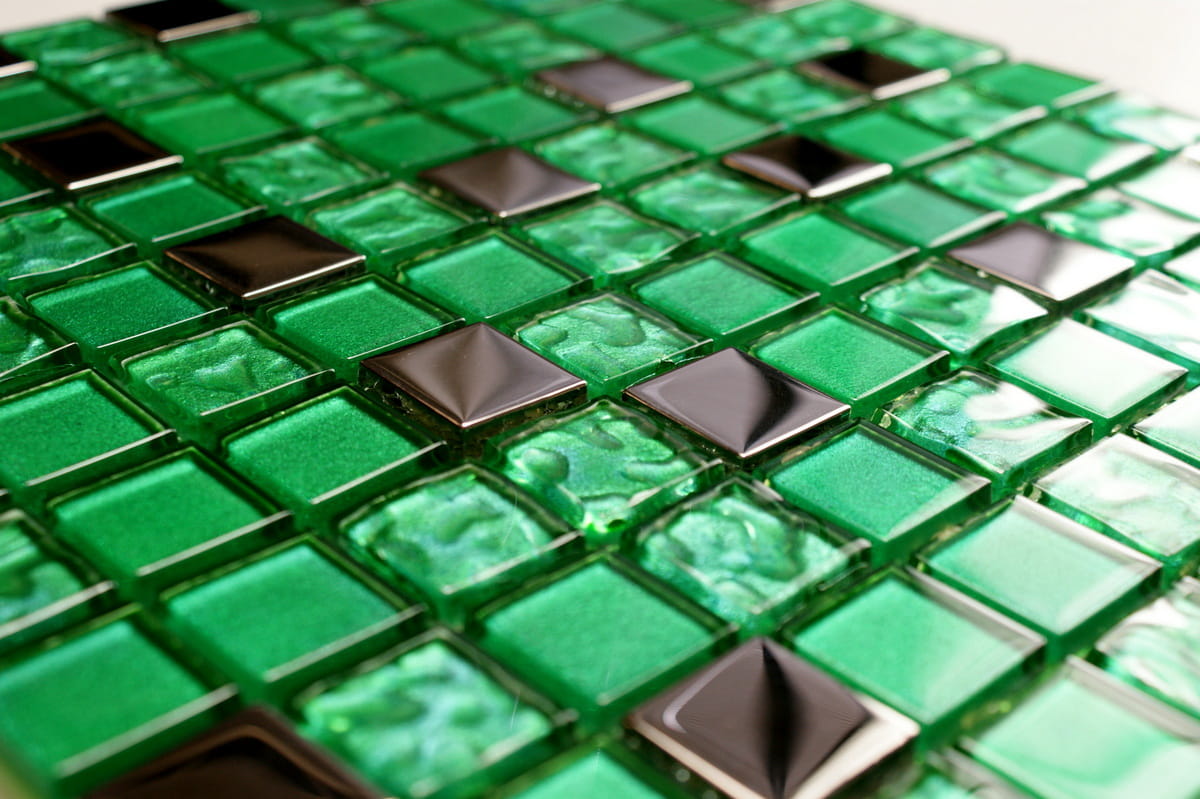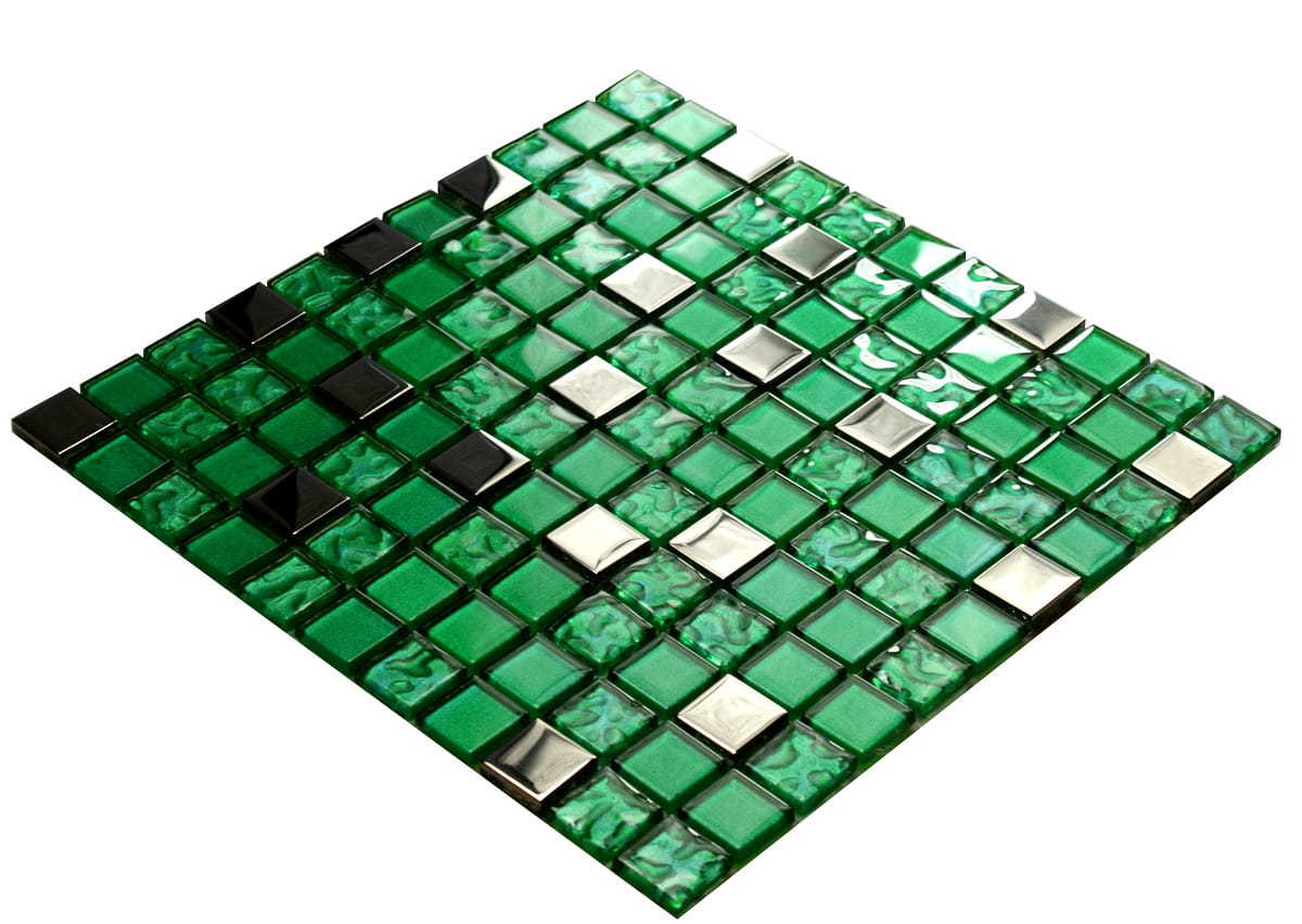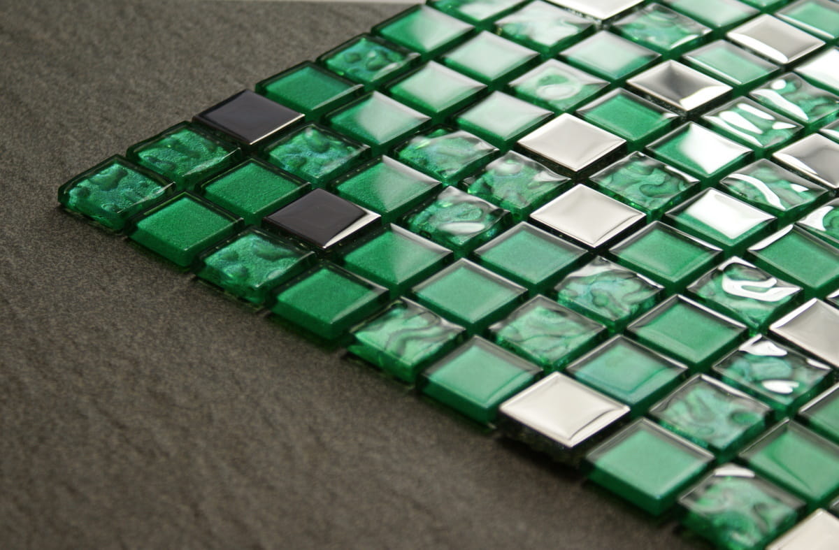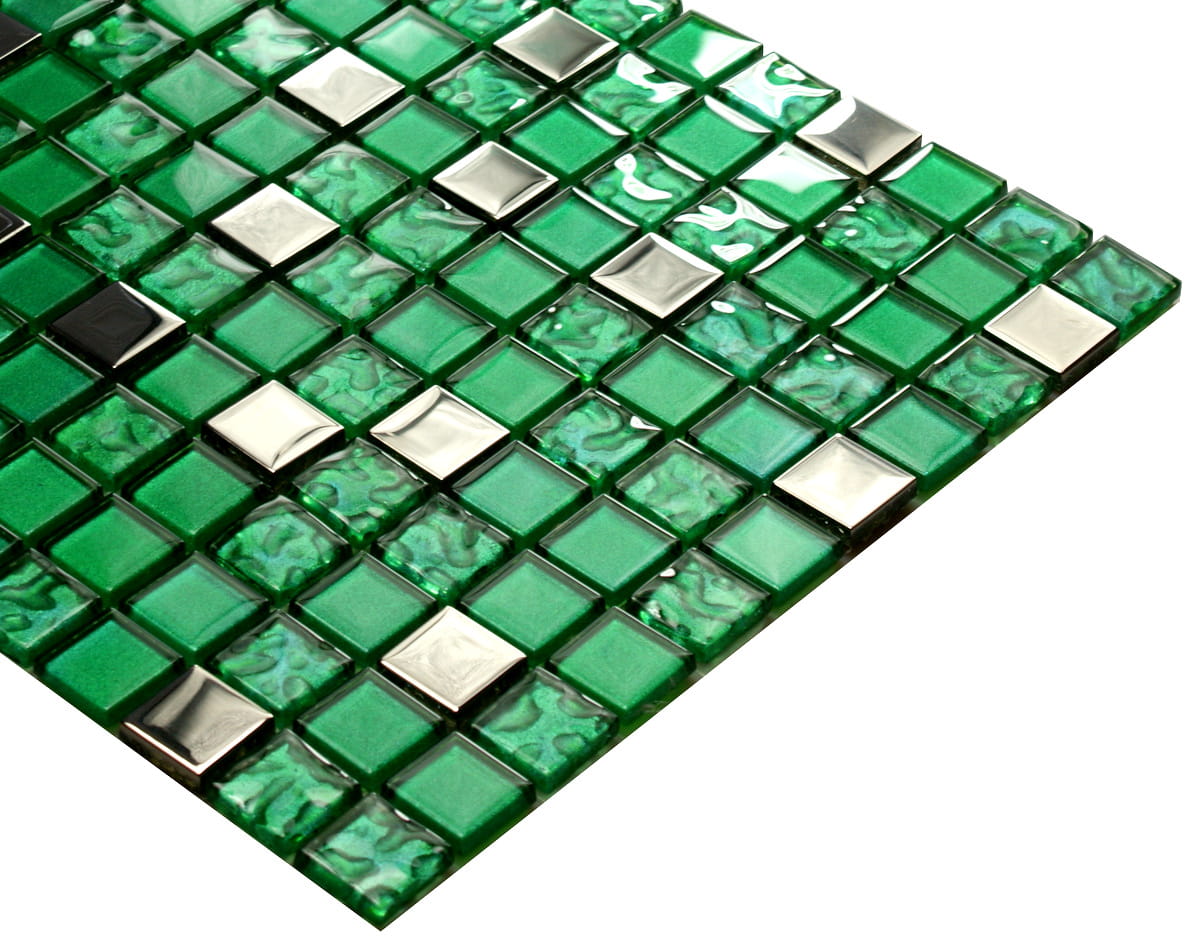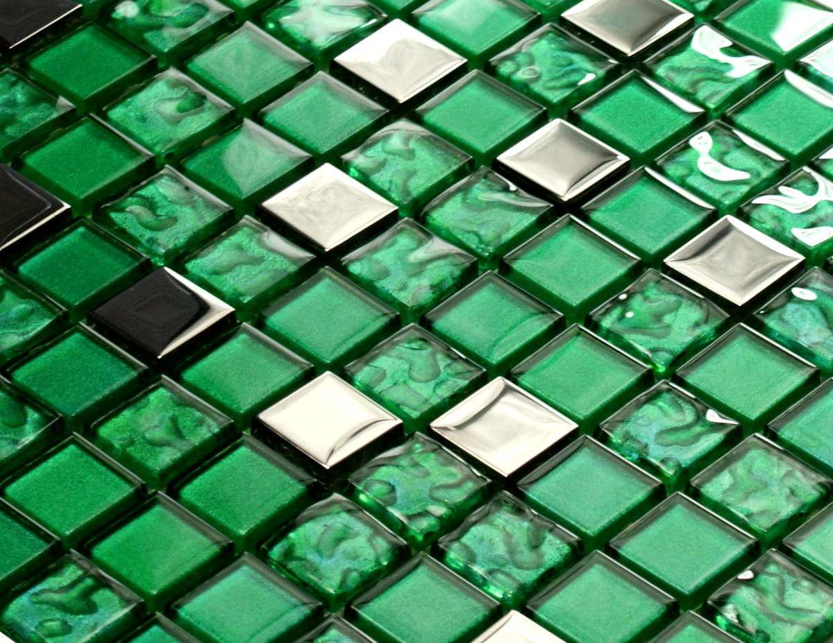 Mozaika szklana w kolorze głębokiej metalicznej zieleni w połączeniu z metalicznym chromowym srebrem.
