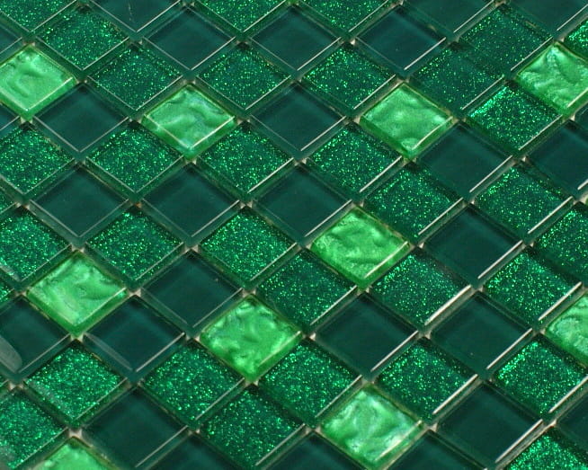 Mozaika szklana w kolorze głębokiej ciemnej zieleni o szmaragdowym odcieniu w połączeniu z metaliczna zielenią i delikatnie mieniącym brokatem