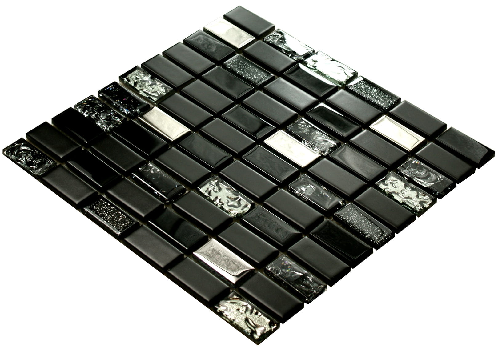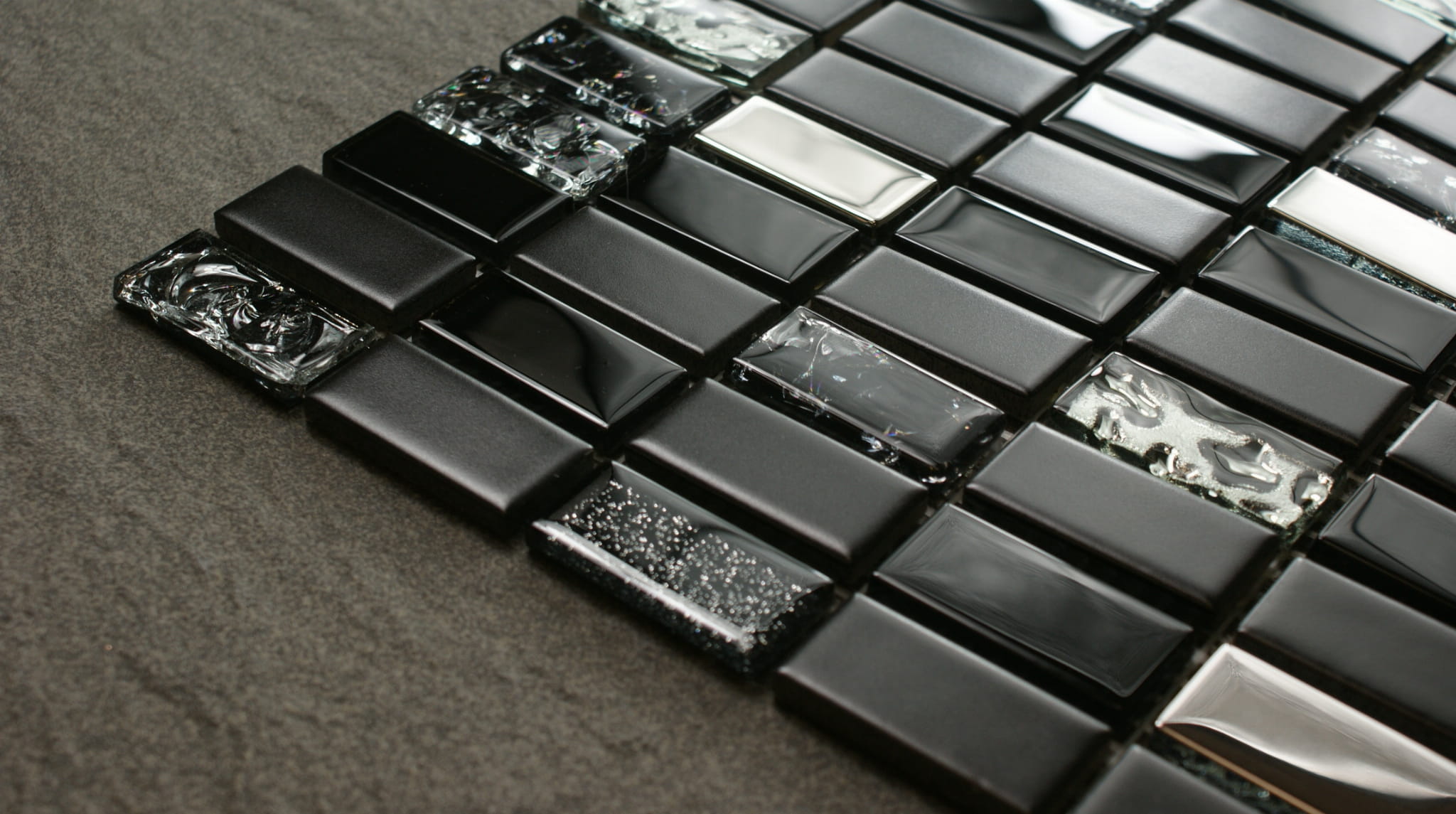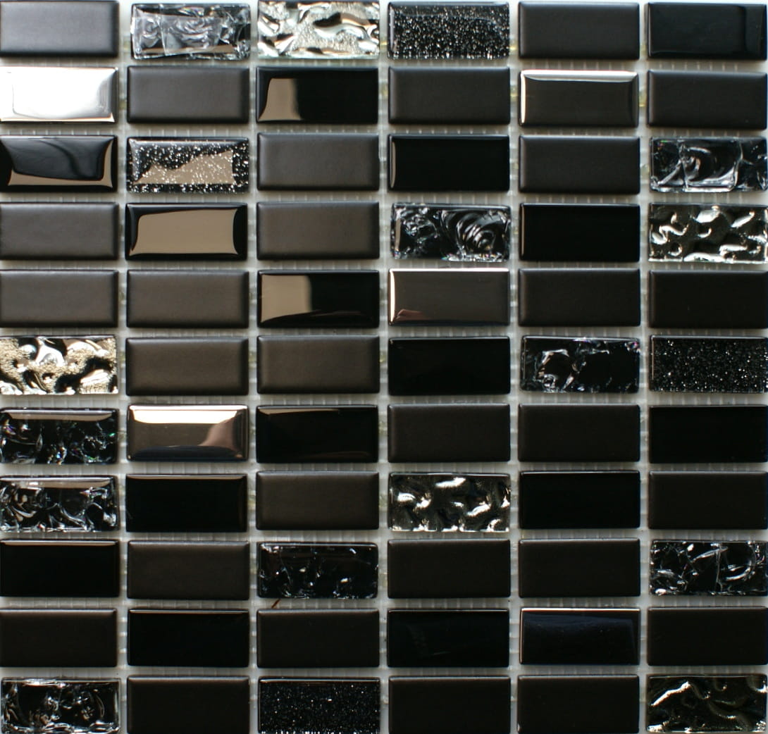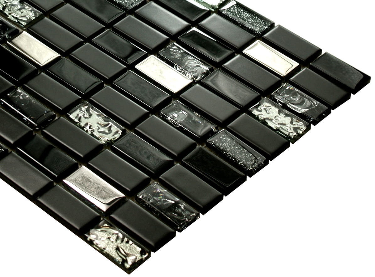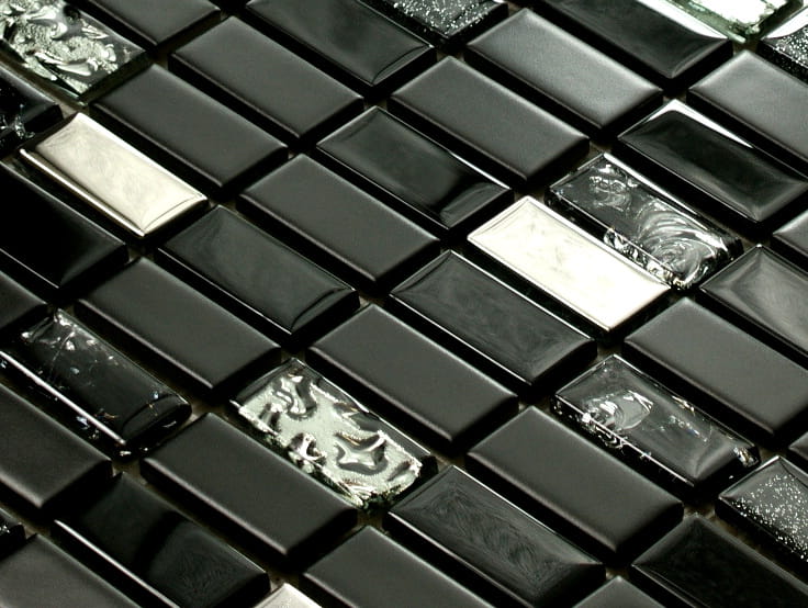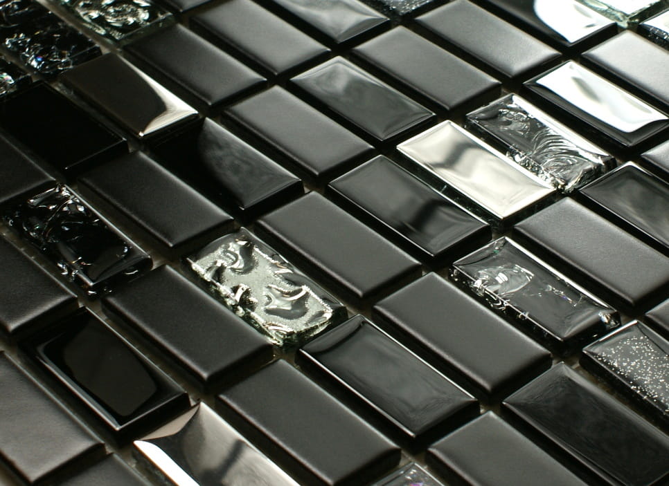 Połączenie mozaiki szklanej w kolorze głębokiej czerni z elementami satynowej ceramiki i niezwykle mieniącego metalicznego srebra