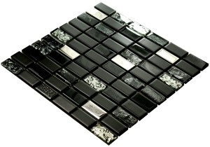 Mozaika szklana czarna w połączeniu z satynową ceramiką i efektownym metalicznym srebrem